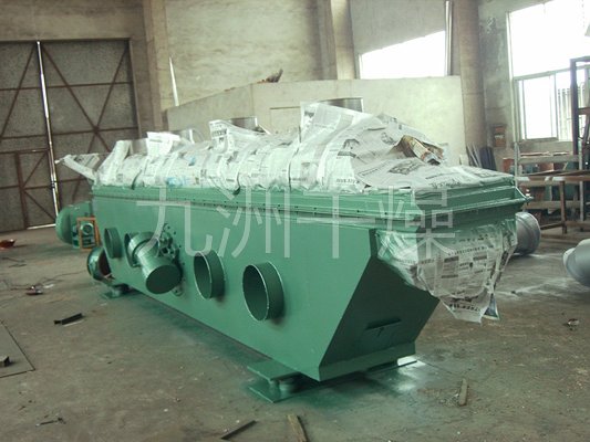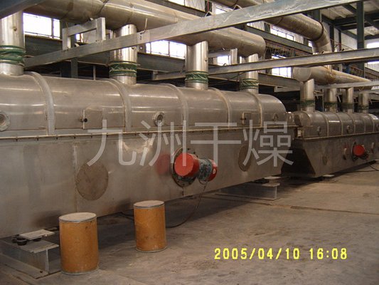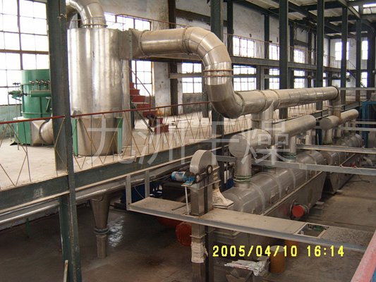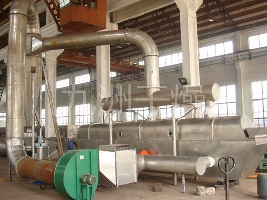 物料自进料进口进入机内,在振动力作用下,物料沿水平面流化床抛掷,向前连续运动,热风向上穿过流化床同湿物料换热后,湿空气经旋风分离器除尘后由排风1:3排出,干燥物料由排料进口排出。