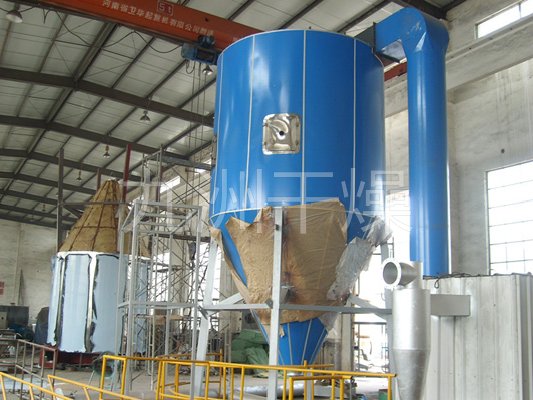 空气经过滤和加热,进入干燥器顶部空气分配器,热空气呈螺旋状均匀地进入干燥室。料液经塔体顶部的高速离心雾化器,(旋转)喷雾成极细微的雾状液珠,与热空气并流接触在极短的时间内可干燥为成品。成品连续地由干燥塔底部和旋风分离器中输出,废气由风机排空。