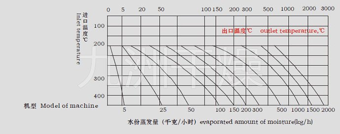注:水份蒸发量与物料的特性及热进风、出口温度相关。当出口温度为90oC,其水份蒸发曲线见上图(供选型参考),随着产品不断更新,有关参数变更,恕不预先通知。