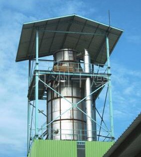 本机组工作过程为料液通过隔膜泵高压输入,喷出雾状液滴,然后同热空气并流下降,大部分粉粒由塔底排料口收集,废气及其微小粉末经旋风分离器分离,废气由抽风机排出,粉末由设在旋风分离器下端的授粉筒收集,风机出口还可装备二级除尘装置,回收率在96-98%以上。