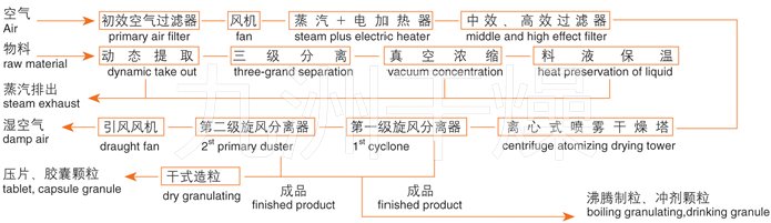 中药浸膏高速离心喷雾装置是离心式喷雾干燥技术在特定物料干燥中的应用,也是利用高速离心式雾化器使物料分散成雾状,与热空气充分接触,完成瞬间干燥,形成粉状成品的干燥装置。