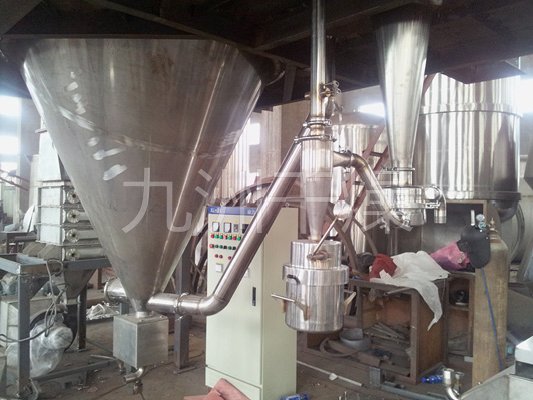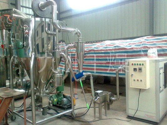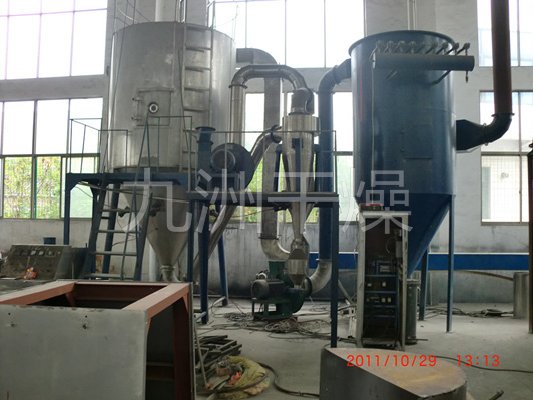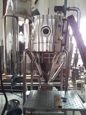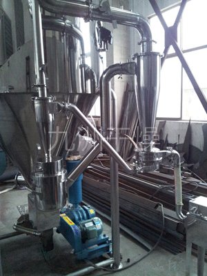 该机采用全封闭形式,所有部件均采用不锈钢制造,配有三级净化装置,过滤后的空气达十万级要求。筒体与顶部装有冷壁装置,使壁温<80℃,干燥塔内装有气刷扫塔装置。经该机干燥后的中药浸膏粉,不会出现焦化变质现象,大大增加了收粉率(95%以上),而且不会产生混药现象和粘壁现象。