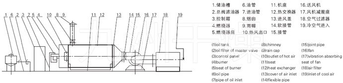 燃料通过燃烧器燃烧,产生高温燃气。并借助具有强化换热措施的热风炉将高温燃气的热量传导给被加热的空气,高温燃气经热量散发后温度降低至250℃后排到大气中。需加热的空气通过选配的鼓风机强送入热风炉,吸热后温度升至额定值从热风出口处送出,当热风温度达到额定温度上限时,燃烧器会自动停止燃烧或自动转为小火焰燃烧,当热风温度降低到额定下限温度时,燃烧器又会重新点燃运行或转为大火燃烧,升温的速度可以调节进风阀的开度来实现。