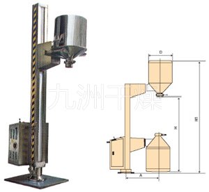 TJG 系列固定提升加料机由两部分组成,即提升机及底座。提升机由机架、液压提升系统及料门翻转机构组成。工作时,先将提升机的料门与料桶扣合,启动提升操作杆,料门与料桶一起上升,启动翻转操作杆,料桶即可番转180度,呈底桶向上姿态并移动到所需位置,利用料门上出料蝶阀,可很容易将物料加入所需的工艺设备中。